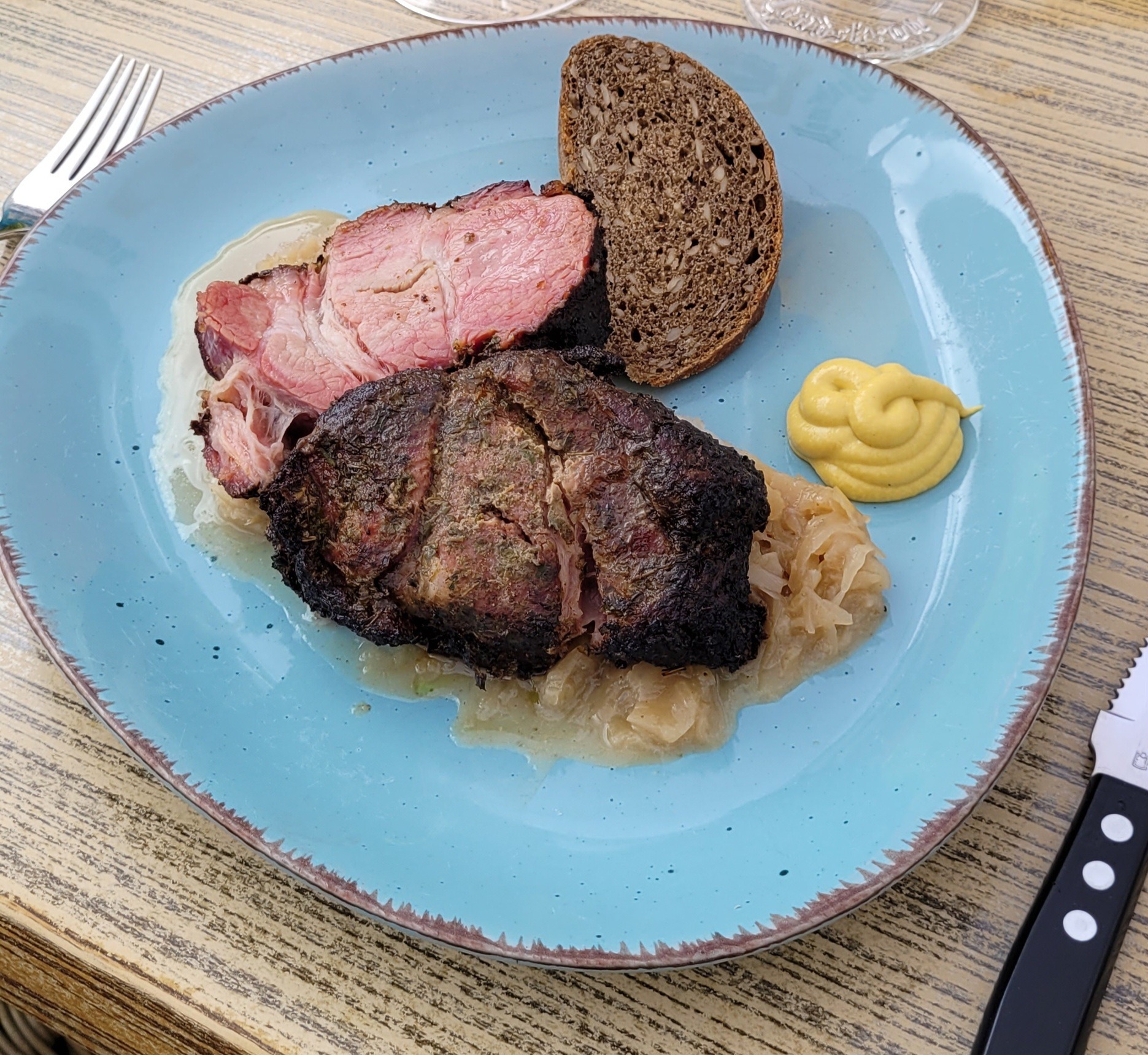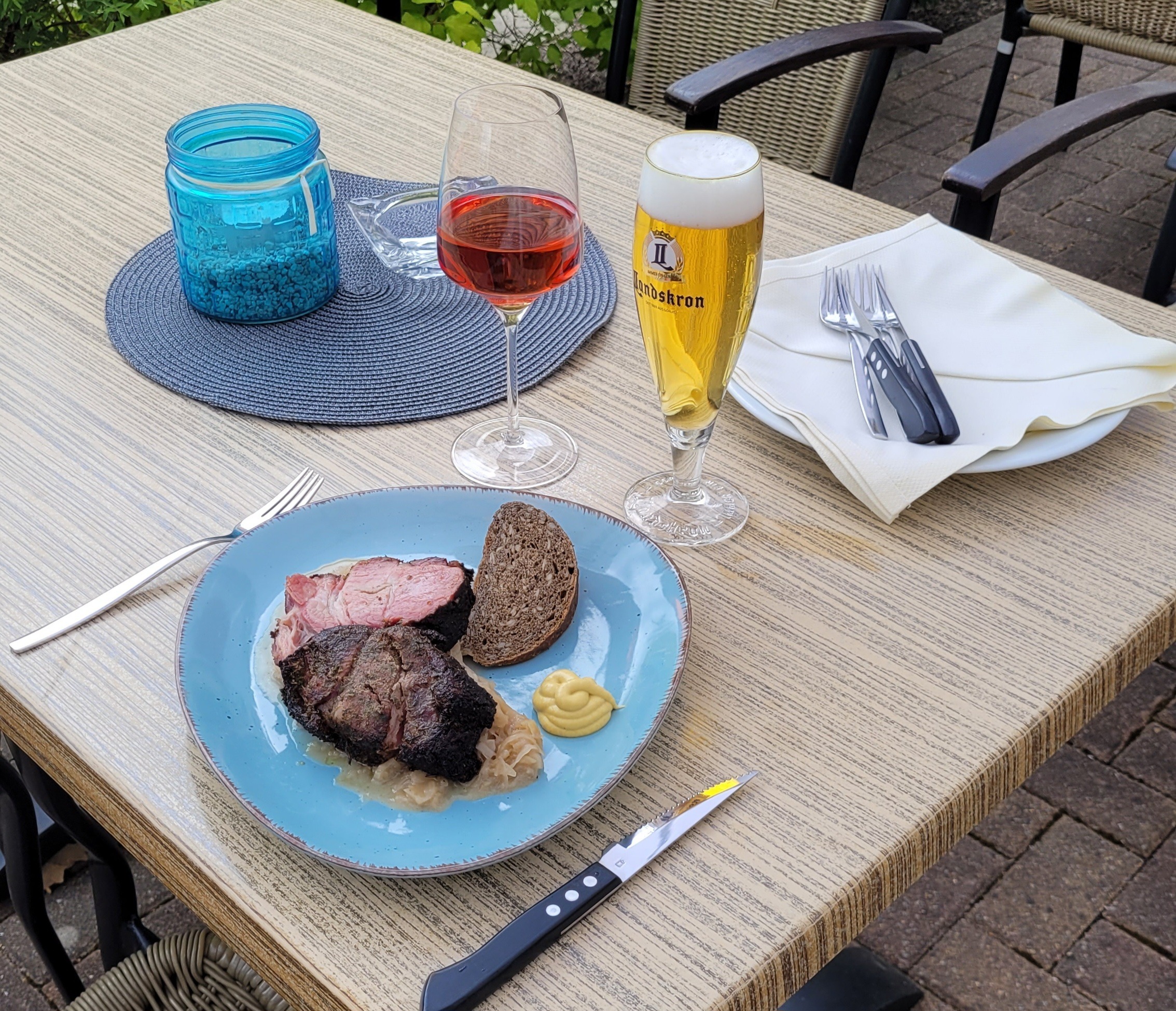 Frisch gegrillter Mutzbraten mit Sauerkraut und Bauernbrot – dazu reichen wir wahlweise ein 0,3l Pils oder Rubin vom Fass oder ein Glas Roséwein 0,2l aus unserem aktuellem Aktionsangebot „Roséwein-Festival“.
